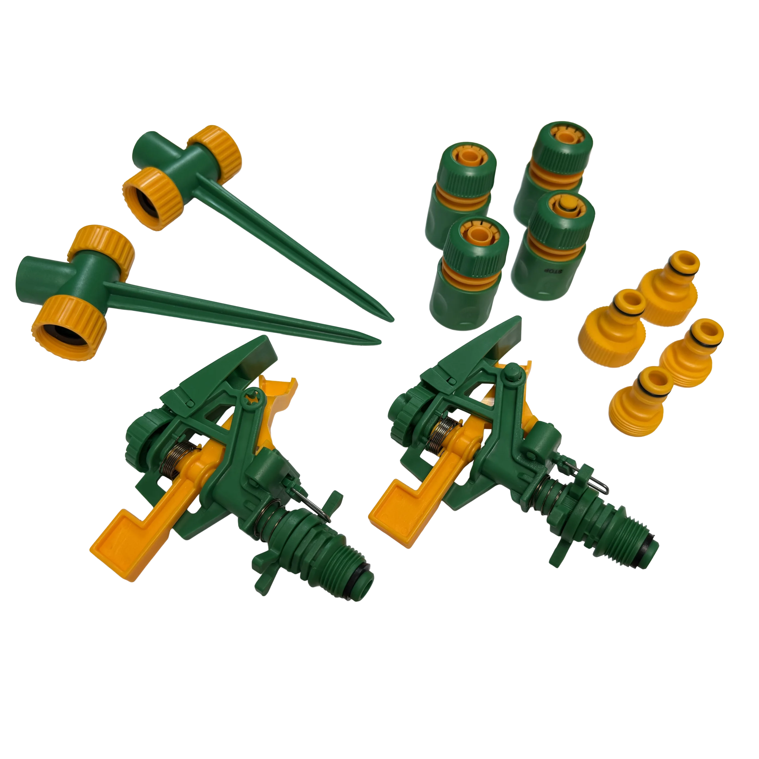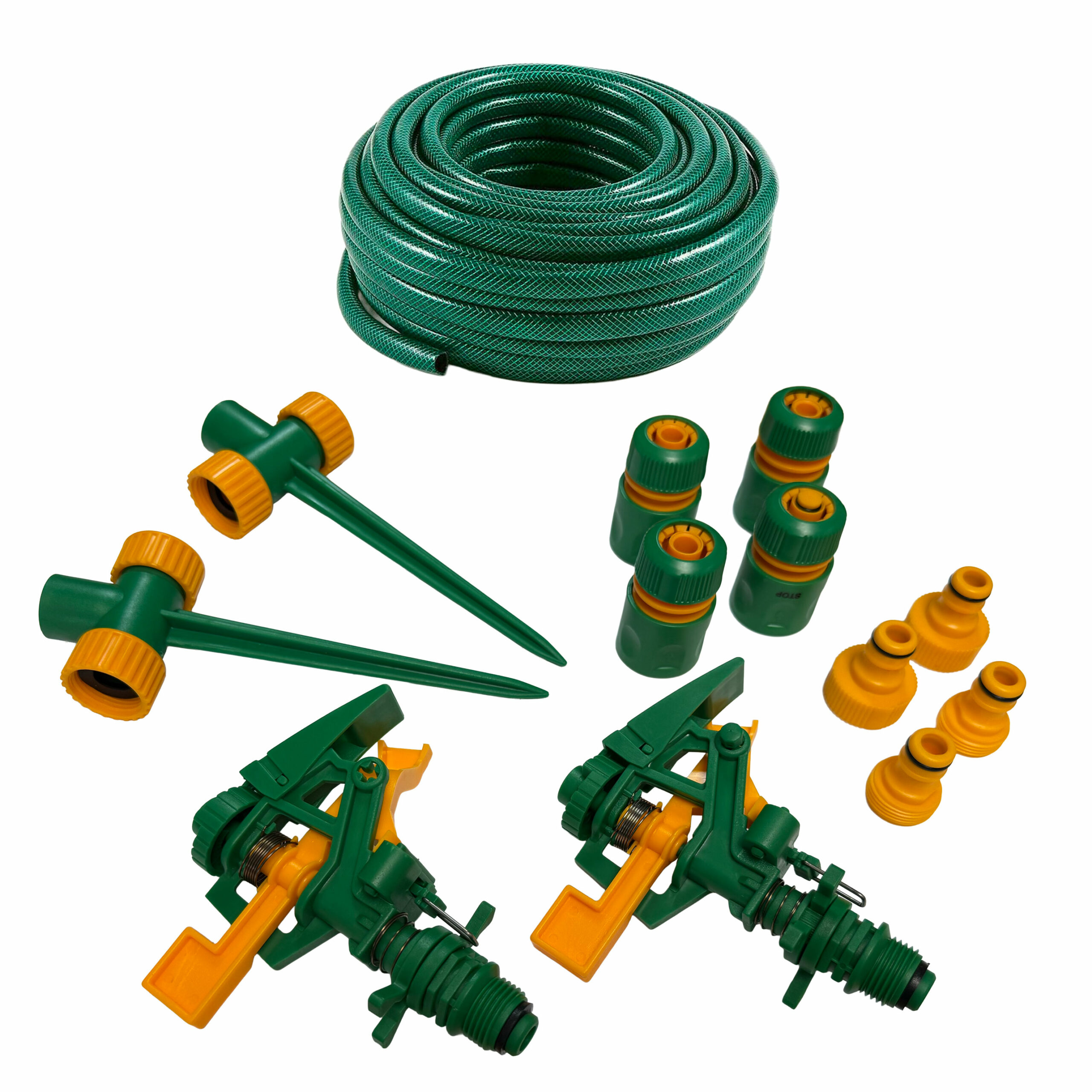 With two spike-mounted sprinkler heads and a complete range of connectors and fittings, you can direct water exactly where it’s needed. Each sprinkler is adjustable, letting you control flow and spray pattern with ease, great for everything from delicate flowerbeds to thirsty lawns.