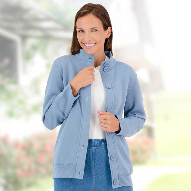 Large, easy-to-use buttons make fastening simple, while two practical front pockets add everyday convenience. The comfortable fit makes this jacket ideal for casual outings, relaxing at home, or layering over seasonal clothing.