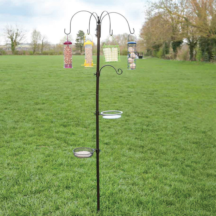 • Complete with seed feeder, suet ball feeder, nut feeder, and suet cake feeder