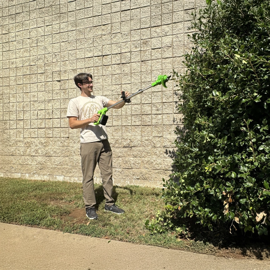 Powered by an 800W motor and a 21V lithium-ion battery, the GreenEdge Pro runs for up to 60 minutes on a single charge. It comes with six interchangeable cutting heads, each designed for a specific task: