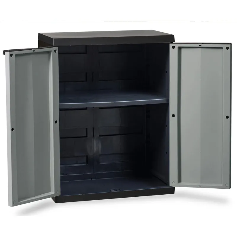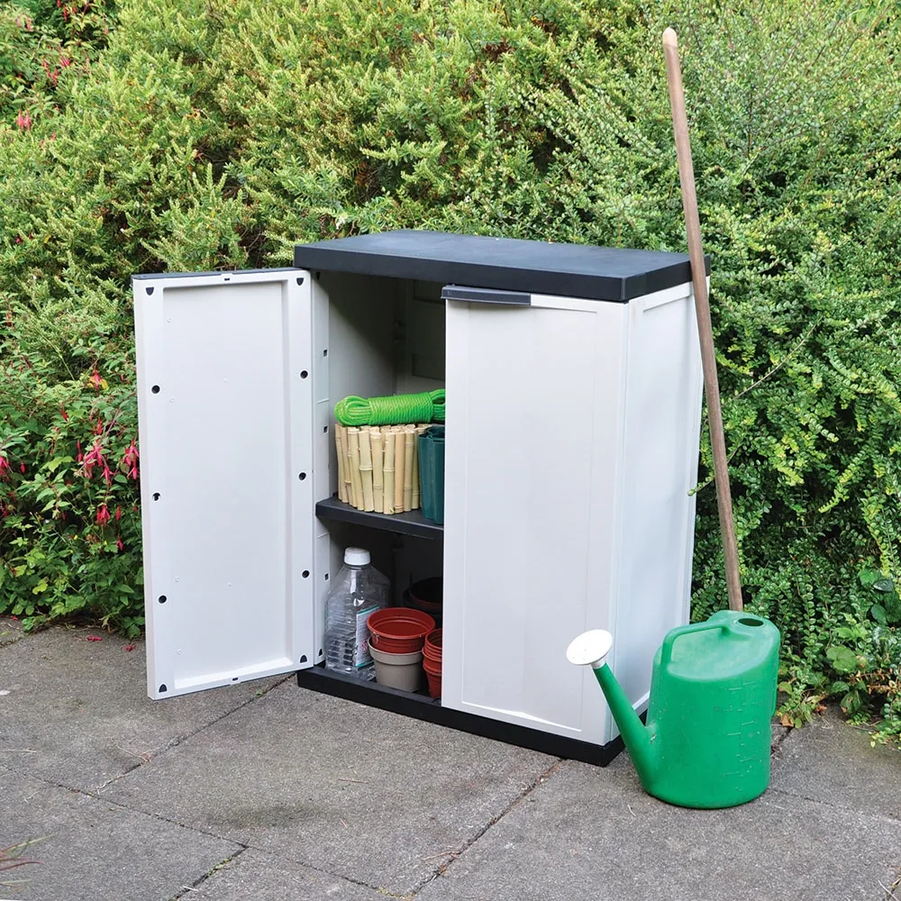 Made from sturdy weatherproof plastic and features two front opening doors with a multi position shelf.