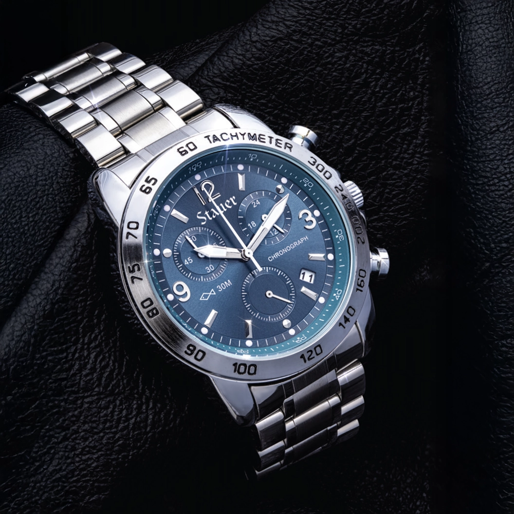 Equipped with a precision quartz movement, this chronograph includes a stopwatch function for timing any mission, a date window between 4 and 5 o’clock for everyday practicality, and a tachymeter bezel for measuring speed and distance. Whether you’re leading a double life or simply multitasking through the day, this watch is your secret weapon.