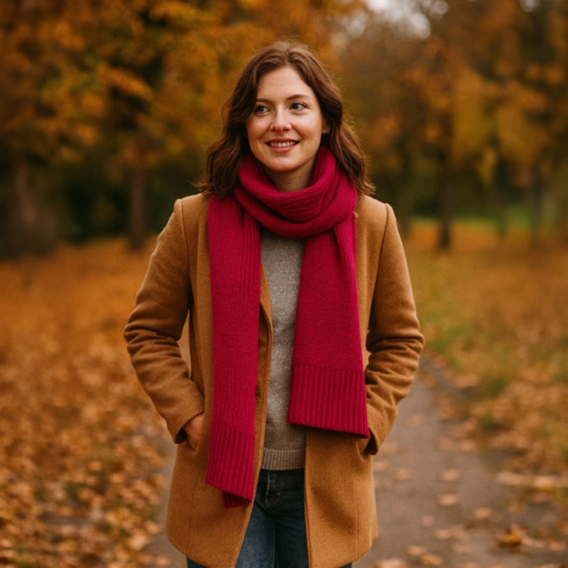 Measuring 155 × 37 cm, the scarf offers generous coverage for easy layering over coats, jackets, or knitwear. Its classic knitted texture and rich red tone create a timeless yet vibrant accent that complements a wide range of seasonal outfits.