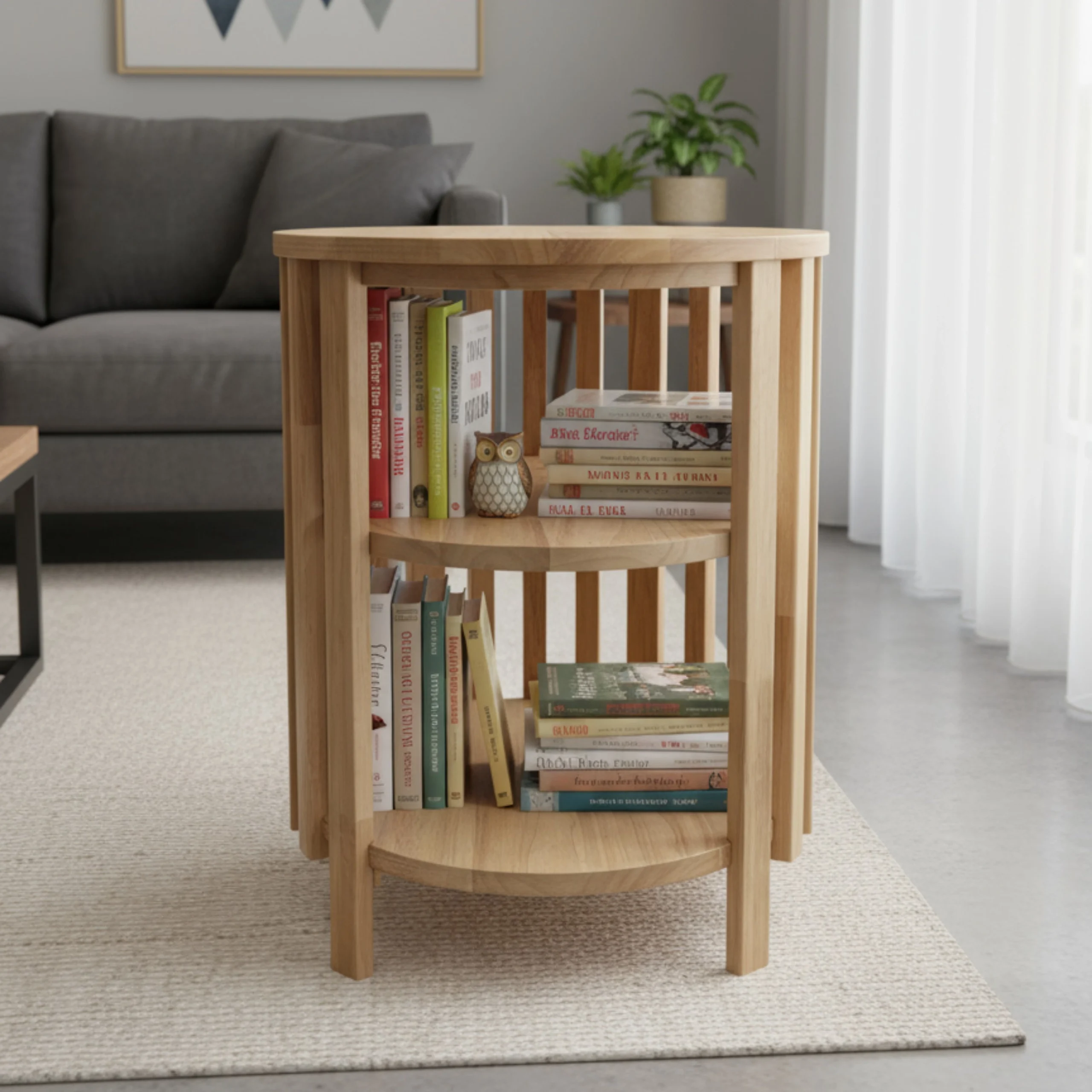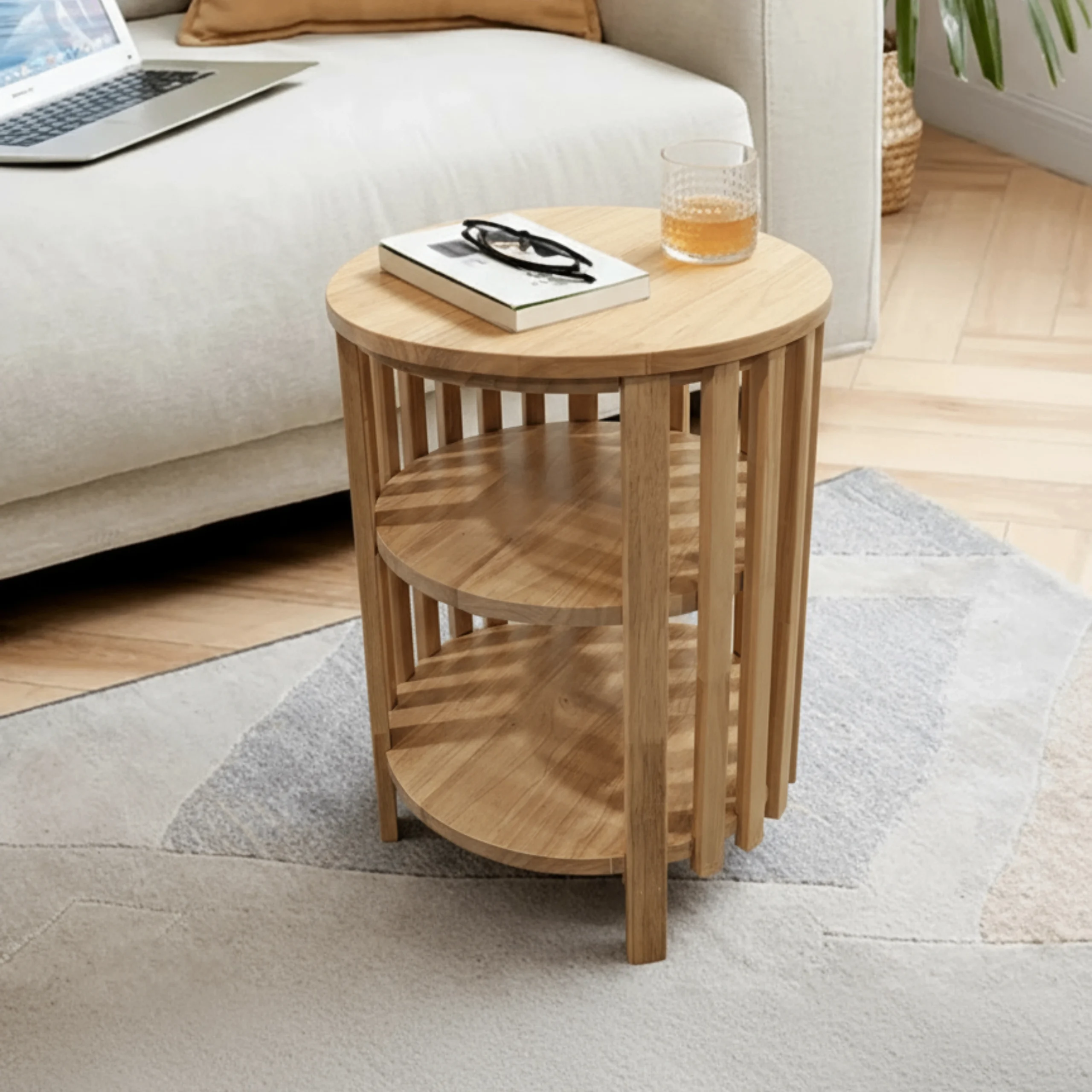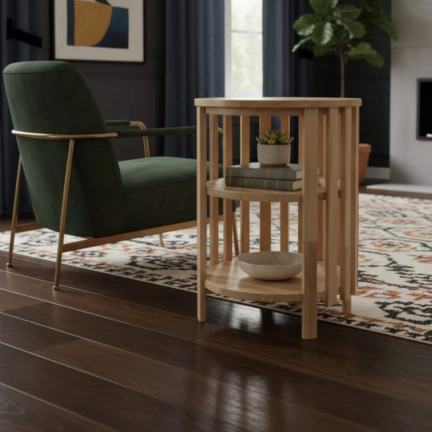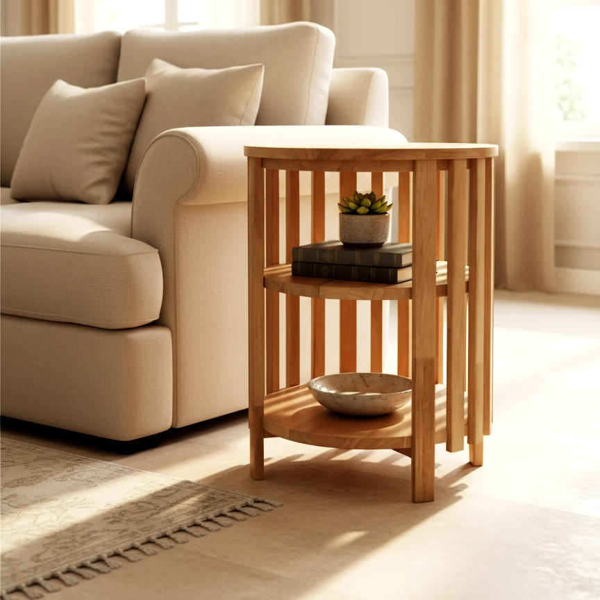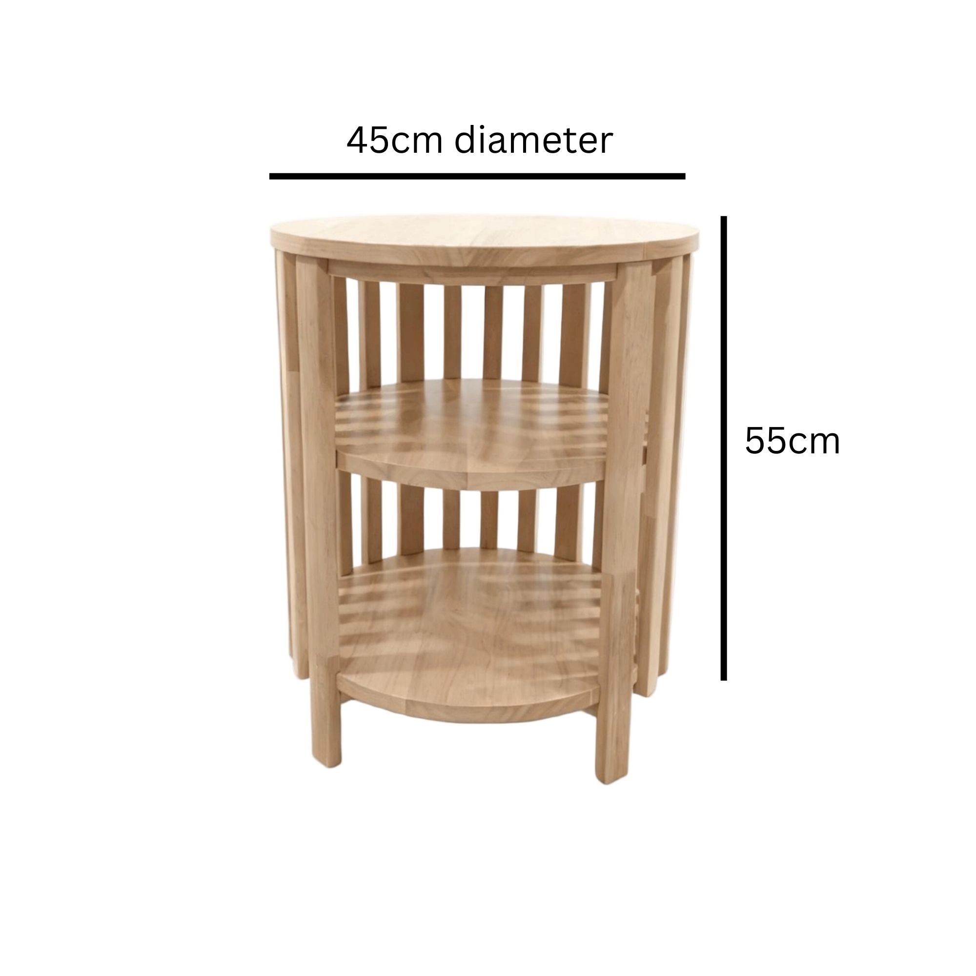 Practical as well as decorative, the table features two built-in shelves, perfect for storing books, magazines, or displaying decorative accessories. Compact and versatile, it works equally well beside a sofa, armchair, or in a cosy reading nook.