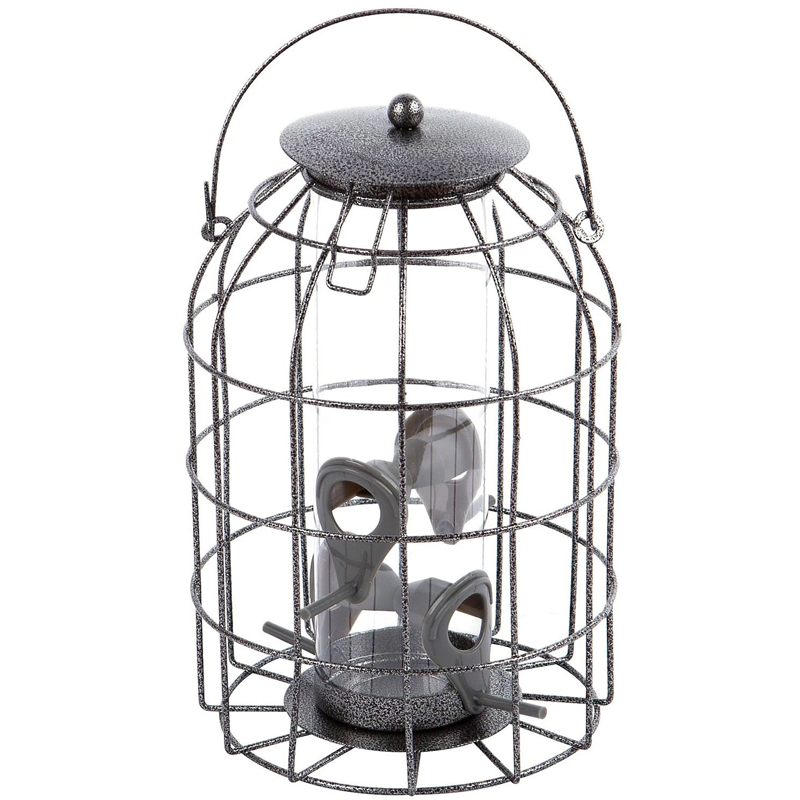 The feeder features a durable outer cage made from powder-coated metal that prevents squirrels from reaching the feeding ports. Birds can easily slip through the gaps to access the seed, while squirrels are blocked by the robust barrier. A secure lid keeps the seed protected from weather and tampering, and the clear reservoir lets you monitor seed levels at a glance.