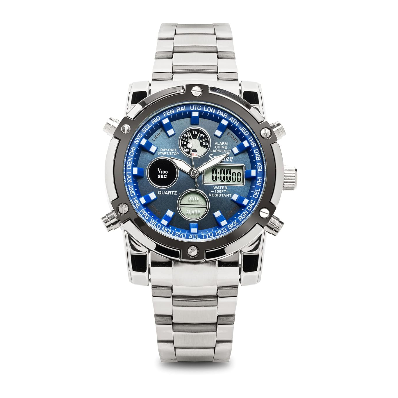 The watch’s handsome steel blue dial seamlessly blends an analog watch face with a stylish digital display. It’s a stopwatch, calendar, and alarm, and a crown coupled with water resistance to 30 meters makes this watch up for under water adventures.