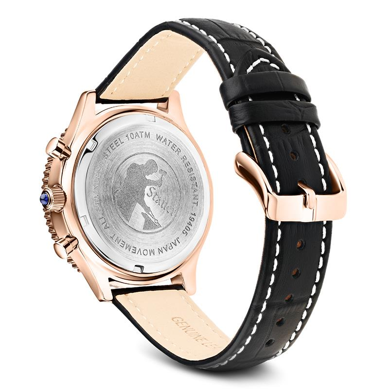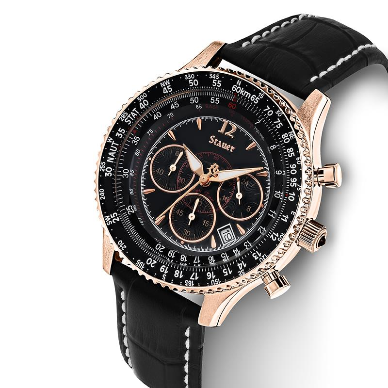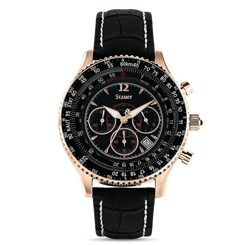 The Stauer Flyboy 1916™ features a stunning dial, set inside a case fused in warm rose gold. Three tachymeters and a movable bezel measure speed and ascent and the chronograph functions allow you to measure elapsed time. Interior complications mark minutes and hours and include a 24-hour display. The watch is water-resistant to 10 ATM and features a crocodile-embossed, genuine leather band. Every decent Ace should have one up his sleeve.