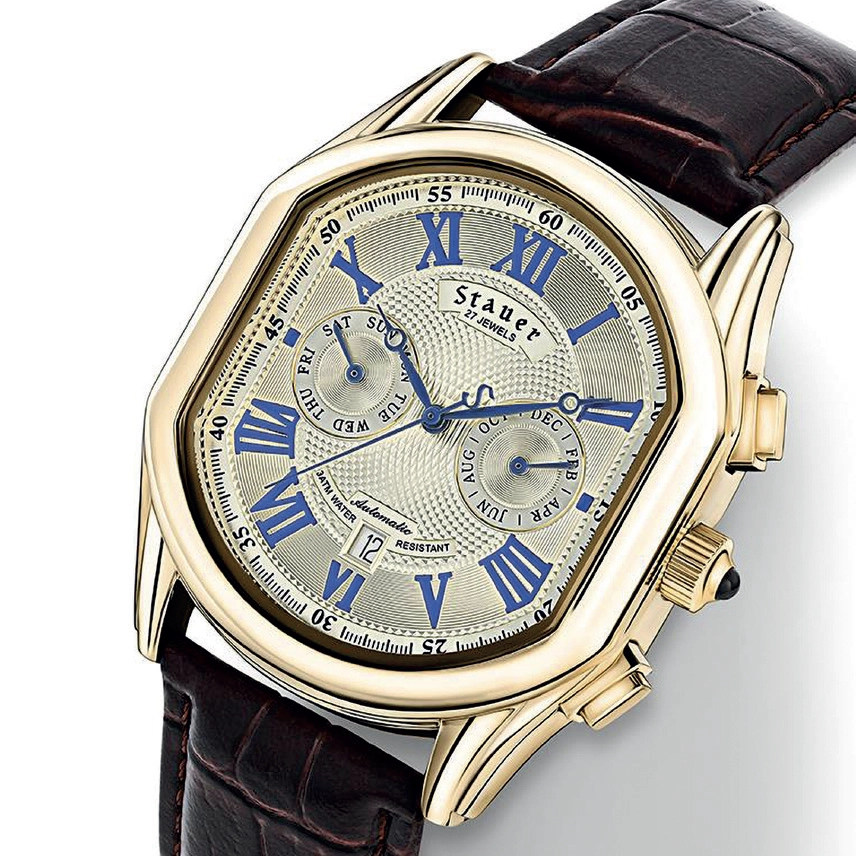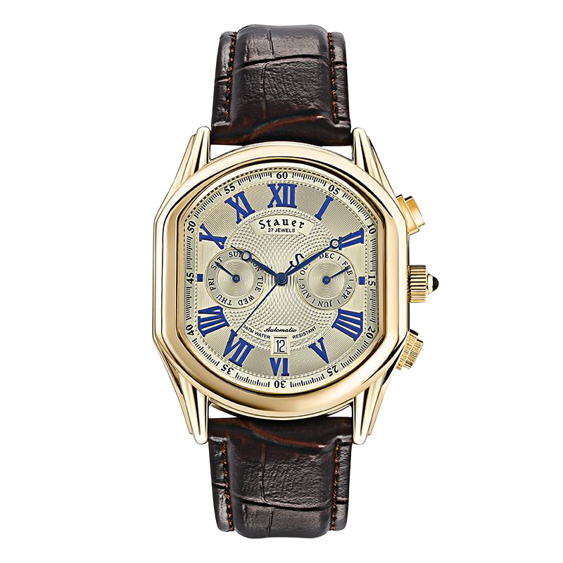 Every detail of the Stauer Meisterzeit has been engineered to replicate the complexities of early multifunction watches. The 27-ruby-jewel movement, inspired by a 1923 patent, drives the self-winding mechanism. Two interior dials track the day and month, while the exhibition back allows you to view the intricate mechanics that power the watch through the movement of your wrist.