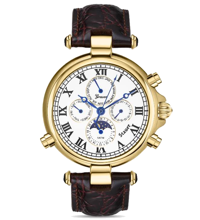 Business Week elucidated, “It’s the complications that can have the biggest impact on price.” (July 2003). Our Graves watch is no exception. Its four internal complications effortlessly display the month, day, date, and a 24-hour cycle showcasing the dance of the sun and the moon. Powered by the wearer’s movement, this watch is a testament to self-sustaining elegance, eliminating the need for batteries or manual winding. The seamless motion of the hands is facilitated by 27 embedded rubies.